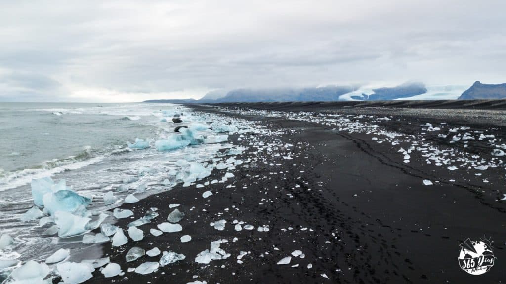 Diamond Beach: fica na “foz” do lago Jökulsárlón e recebe as peças de um puzzle glaciar (glaciar Breidamerkurjokull) que se soltam e viajam até ao mar. Muitos ficam presos na praia e, à medida que se vão partindo e derretendo, encontram-se pedaços cada vez mais pequenos, espalhados pela areia, como diamantes gigantes espalhados. Talvez tenha sido dos locais onde encontrámos mais turistas, mas, depois dos autocarros saírem, é fácil ficar quase sozinho na praia. Estejam atentos ao mar, podem encontrar algumas focas. É difícil explicar como, por vezes, as paisagens excedem as expectativas. Uma coisa são os relatos, outra é estar no local a observar e ouvir pedaços de “diamantes” gigantes, do tamanho de autocarros, a chocarem uns contra os outros, empurrados pela fúria da corrente, na sua última viagem até ao mar.